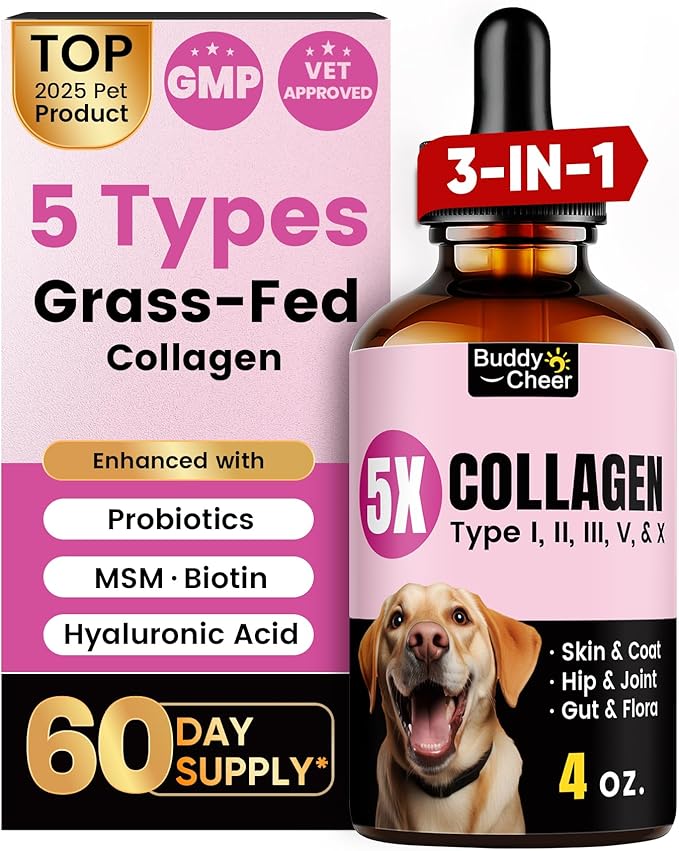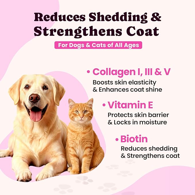 【5 Types Collagen Complex for Dogs & Cats】 With 5 Types of Grass-Fed Dog Collagen (I, II, III, V & X) to provide all-around support for skin & coat, hip & joint health. Infused with MSM, Biotin, and Hyaluronic Acid to boost skin hydration and restore a glossy, smooth coat, while supporting overall skin comfort. Helps maintain joint comfort and flexibility while supporting healthy digestion, keeping your pet active and looking their best inside and out.